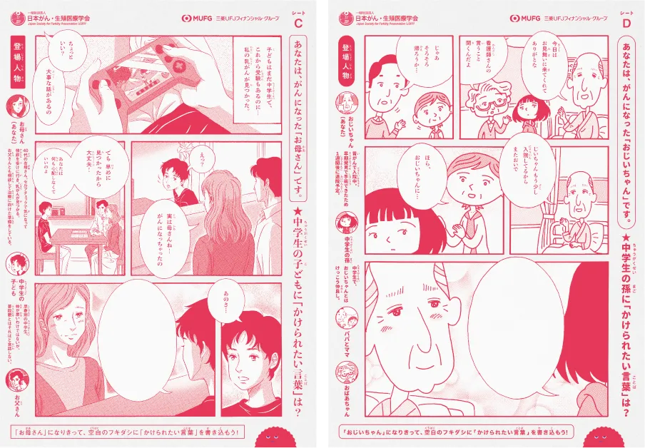 - ・マンガシートを読み、各自がんになった人物になりきって自分の心の中を想像し、相手に「かけられたい言葉」をセリフとして言語化。マンガ内の空欄を埋める。